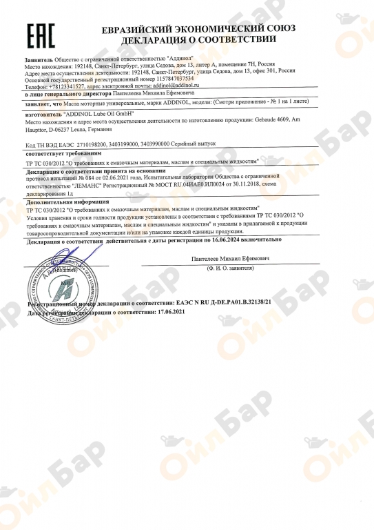Спецификации и лицензии Addinol Semi Synth 1040: